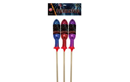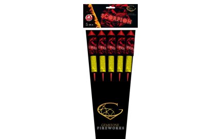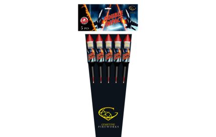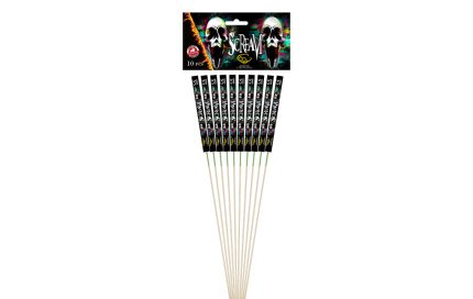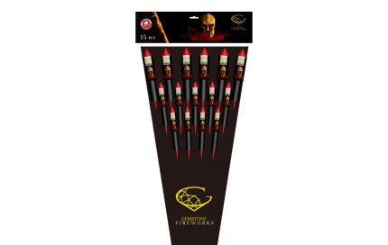 A pack of rockets of two sizes with effects which include green glittering bursts with red dahlia stars, brocade crown effects, colourful peonies and red wave effects with crackles, brocade effects with red glittering stars.