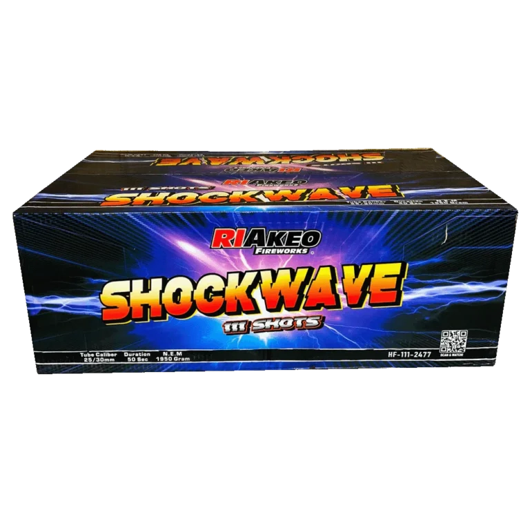 Shockwave by Riakeo Fireworks is a high-impact 111-shot F3 compound cake showcasing new effects for 2025. Combining 25mm and 30mm tubes, this 1.3G powerhouse delivers 50 seconds of continuous, explosive aerial displays. Available exclusively at More Than Fireworks, with fast UK delivery.