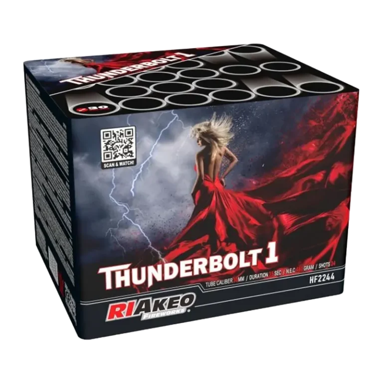 Thunderbolt 1 by Riakeo Fireworks delivers 24 powerful shots in a dynamic 35-second display. Ideal for garden parties, now available in the UK.