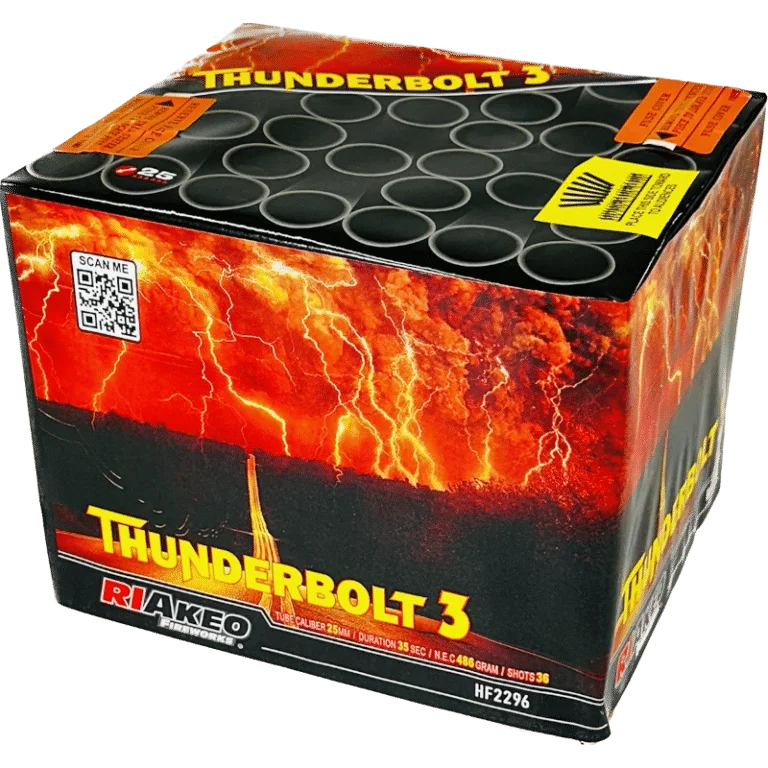 Thunderbolt 3 by Riakeo Fireworks delivers 36 vibrant shots with a dynamic firing pattern. Ideal for creating a captivating display, now available in the UK.