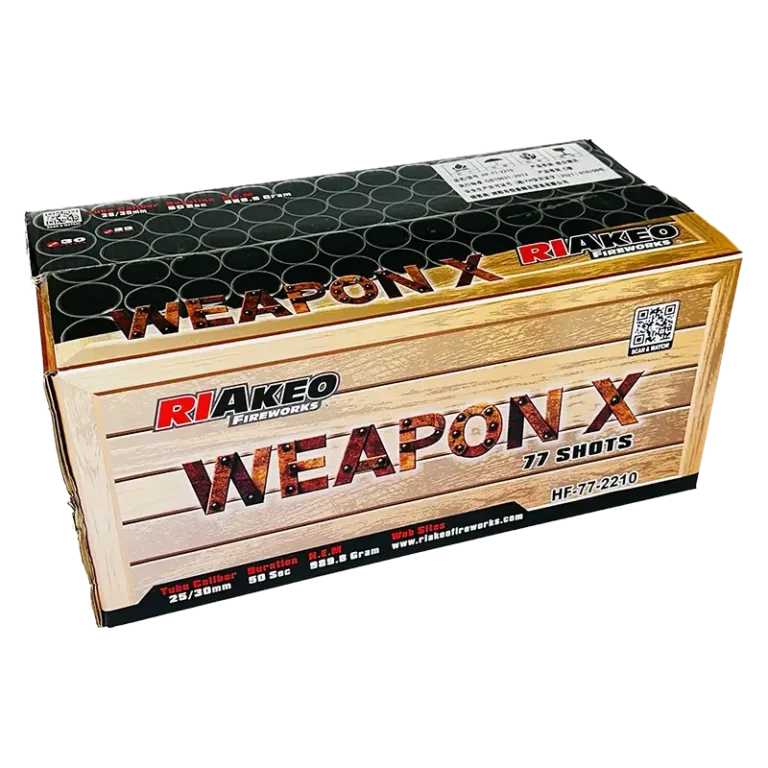 Weapon X by Riakeo Fireworks delivers 77 intense shots featuring dynamic effects in a thrilling 50-second show. Perfect for parties, now available in the UK.